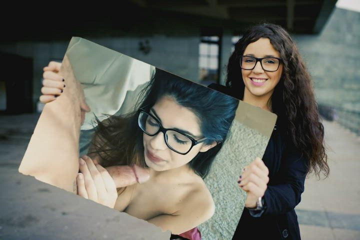 blowjob brunette cum in mouth cumshot facial glasses pussy smile split screen porn clip